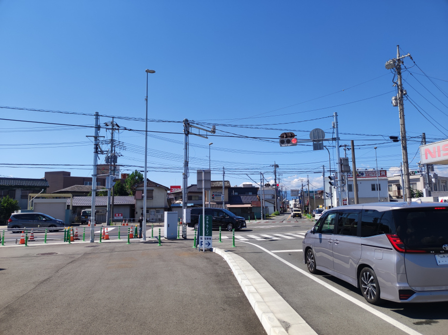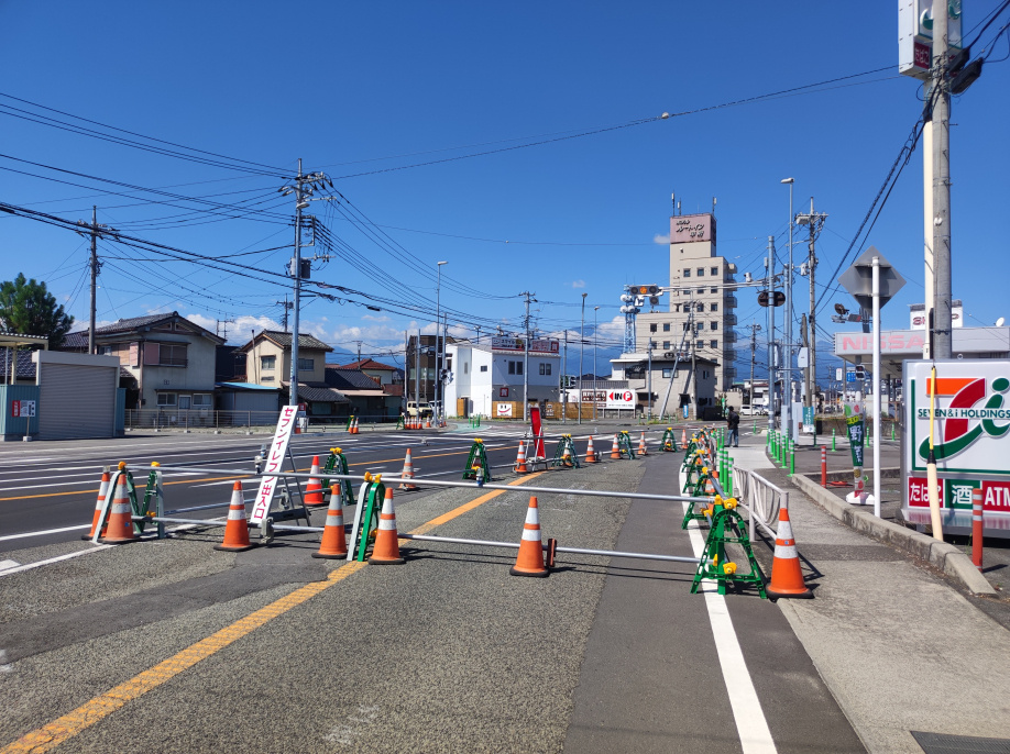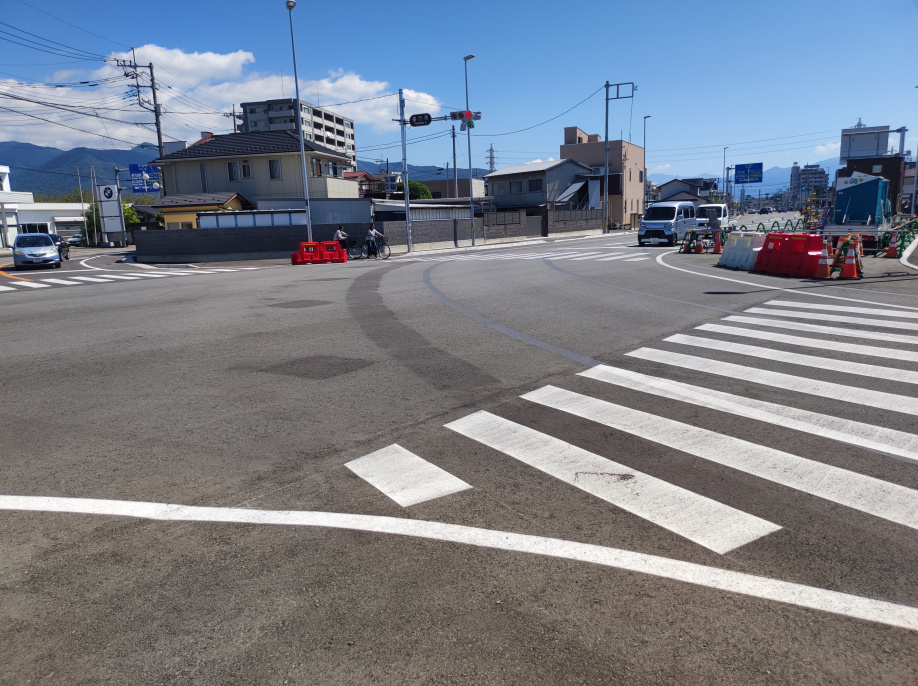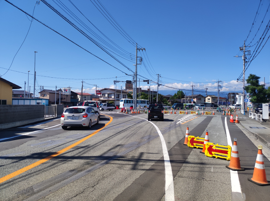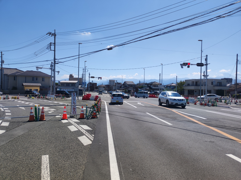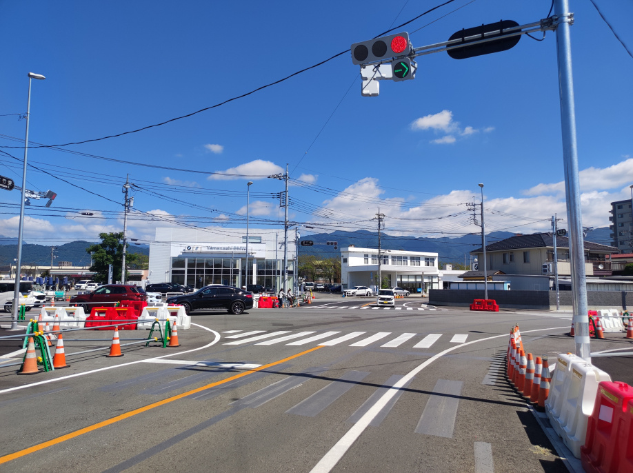 アルプス通りを北へ(緑ヶ丘方面)走り、「竜王」駅方面に行く場合、「貢川交番南」交差点と「貢川交番前」交差点のダブル信号の2つ目を左折する必要がありましたが、ダブル信号の手前を左折すれば行けるようになりました。このダブル信号を1つ回避できるのは助かりますし、渋滞解消にもなるハズです!!