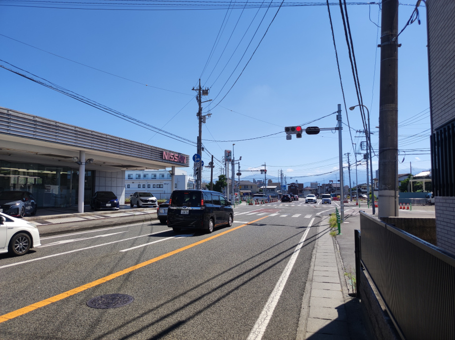 「貢川」交差点、「竜王」方面からアルプス通り方面へ向かう!「日産」の前!