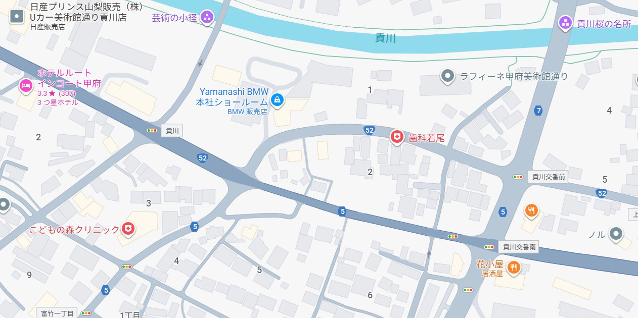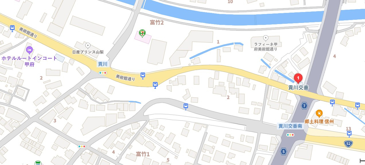 ただし、「貢川交番南」交差点を西に入り、「竜王」駅方面に向かう場合、「BMW」前の「富竹東」交差点と「セブンイレブン」前の「貢川」交差点のダブル信号ができることになります!
